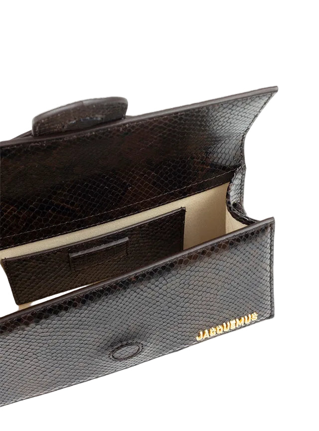Le Grand Bambino in pelle marrone scuro, motivo pitone con logo dorato in rilievo. Battente con chiusura magnetica, manico piatto e tracolla rimovibile. Interno con tasca a soffietto.